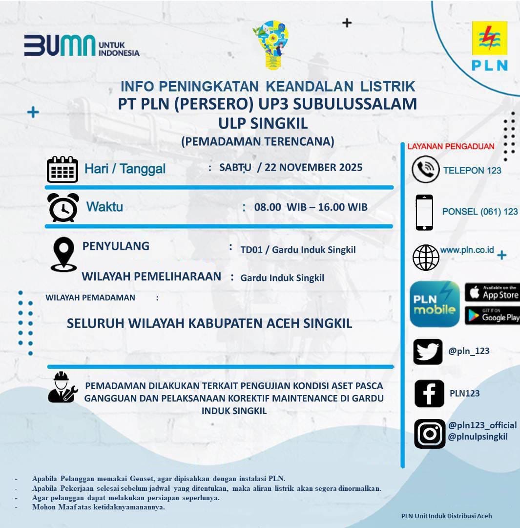 “Demi menjaga keselamatan petugas dan kehandalan jaringan, besok kita akan melakukan pemadaman listrik di seluruh wilayah Kabupaten Aceh Singkil, mulai pukul 08.00 WIB sampai dengan pukul 16.00 WIB,” kata Manajer PLN ULP Singkil, Baihaqi, Jumat (21/11).