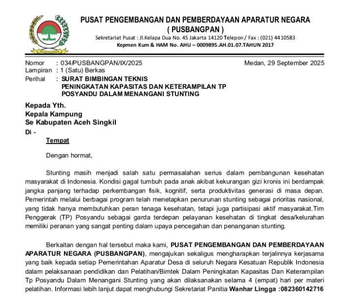Didalam surat tersebut Bimtek akan dijadwalkan pada 24–26 November 2025 mendatang yang berlangsung di Kecamatan Pulau Banyak, Kabupaten Aceh Singkil.
