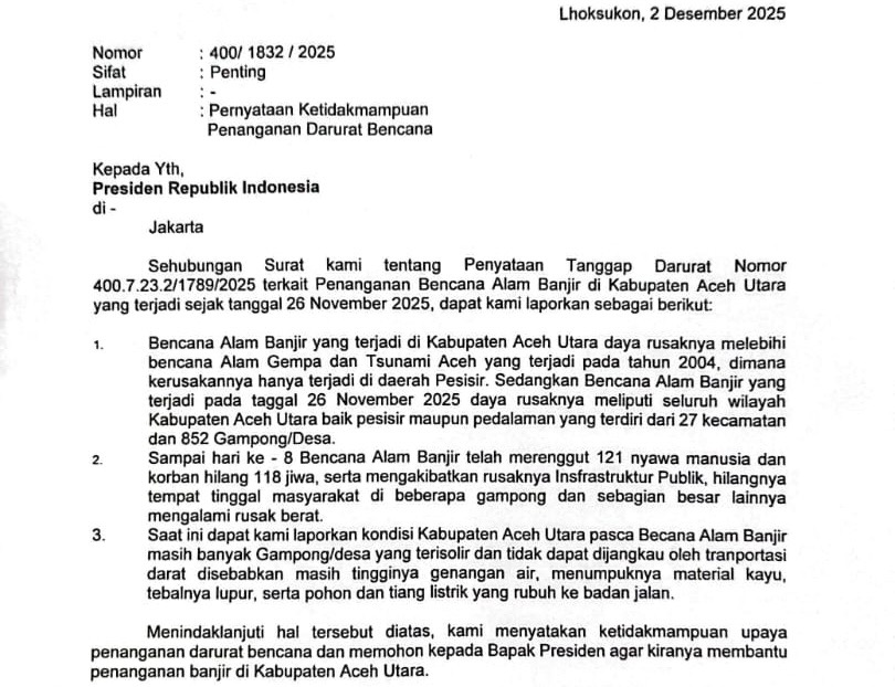 “Atas persoalan tersebut kami menyatakan ketidaksanggupan upaya penanganan darurat bencana dan mohon kepada Presiden Prabowo agar kiranya membantu penanganan banjir di Aceh Utara,” pungkasnya.